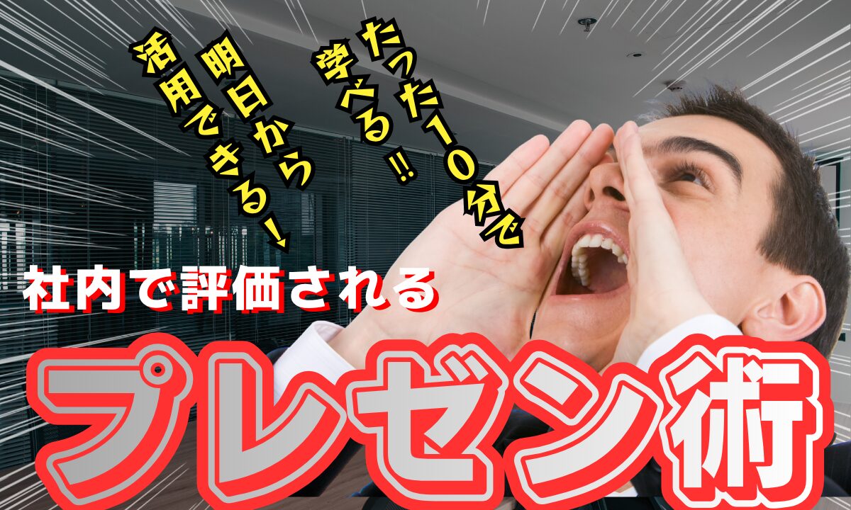 スマホで見てもタイトルがしっかりわかるように目立たせ、インパクトを出すために、プレゼンルームで叫んでいる男性の顔のアップとコミックのようなフォントと強調線を入れてみました。